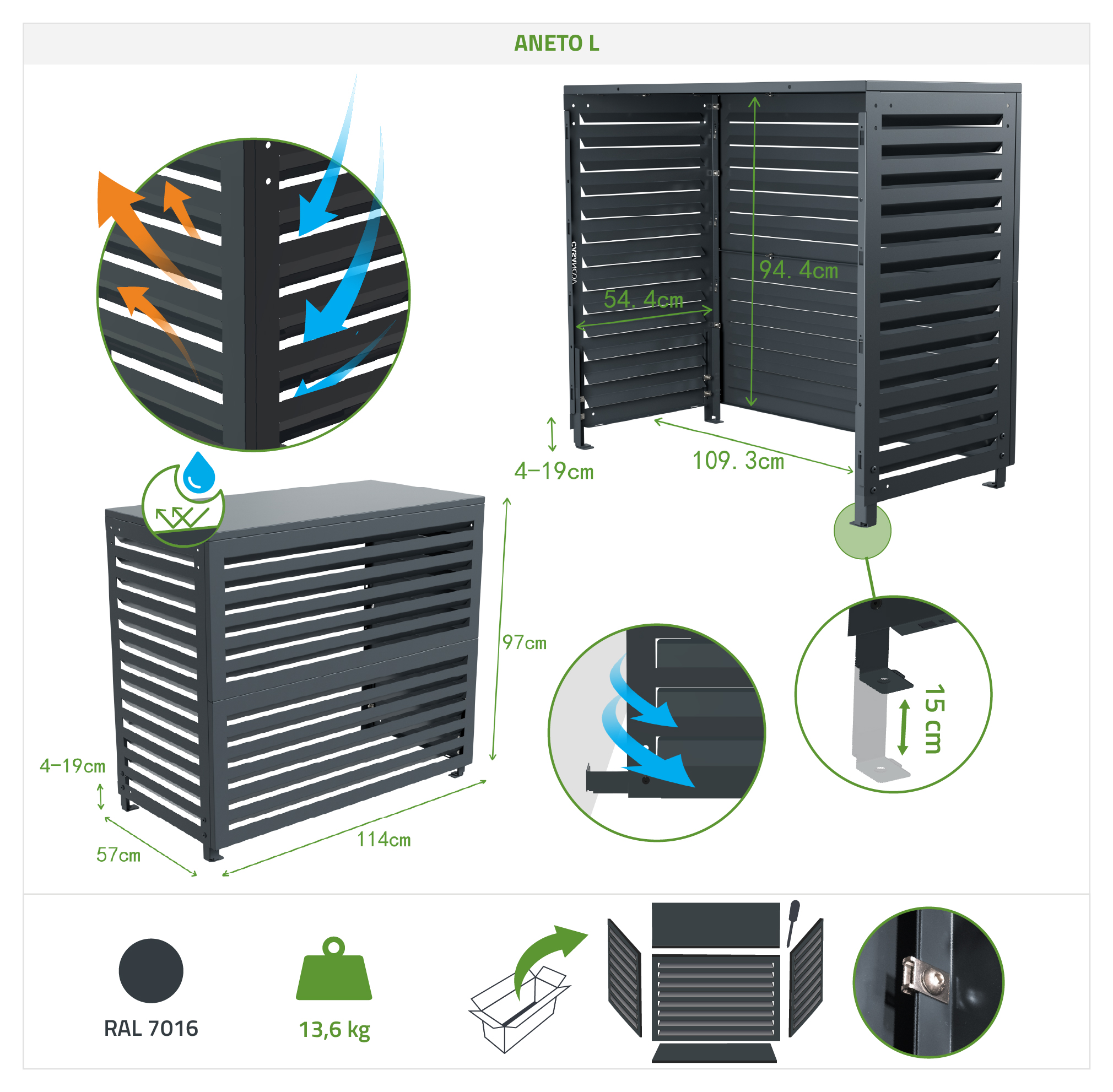 The Aneto aluminum air conditioner cover impresses with its louvered design, offering a discreet and elegant charm. Its aluminum construction provides a refined finish, remarkable lightness, and excellent weather resistance, ideal for long-lasting outdoor use. Thanks to its perforated slats, this air conditioner/heat pump cover allows for good ventilation of the unit while discreetly concealing it. A model with a simple and timeless style, perfect for blending harmoniously with all types of outdoor spaces. The slats of this air conditioner cover are reversible; they can be installed facing up or down to best suit the positioning of your air conditioner or heat pump.