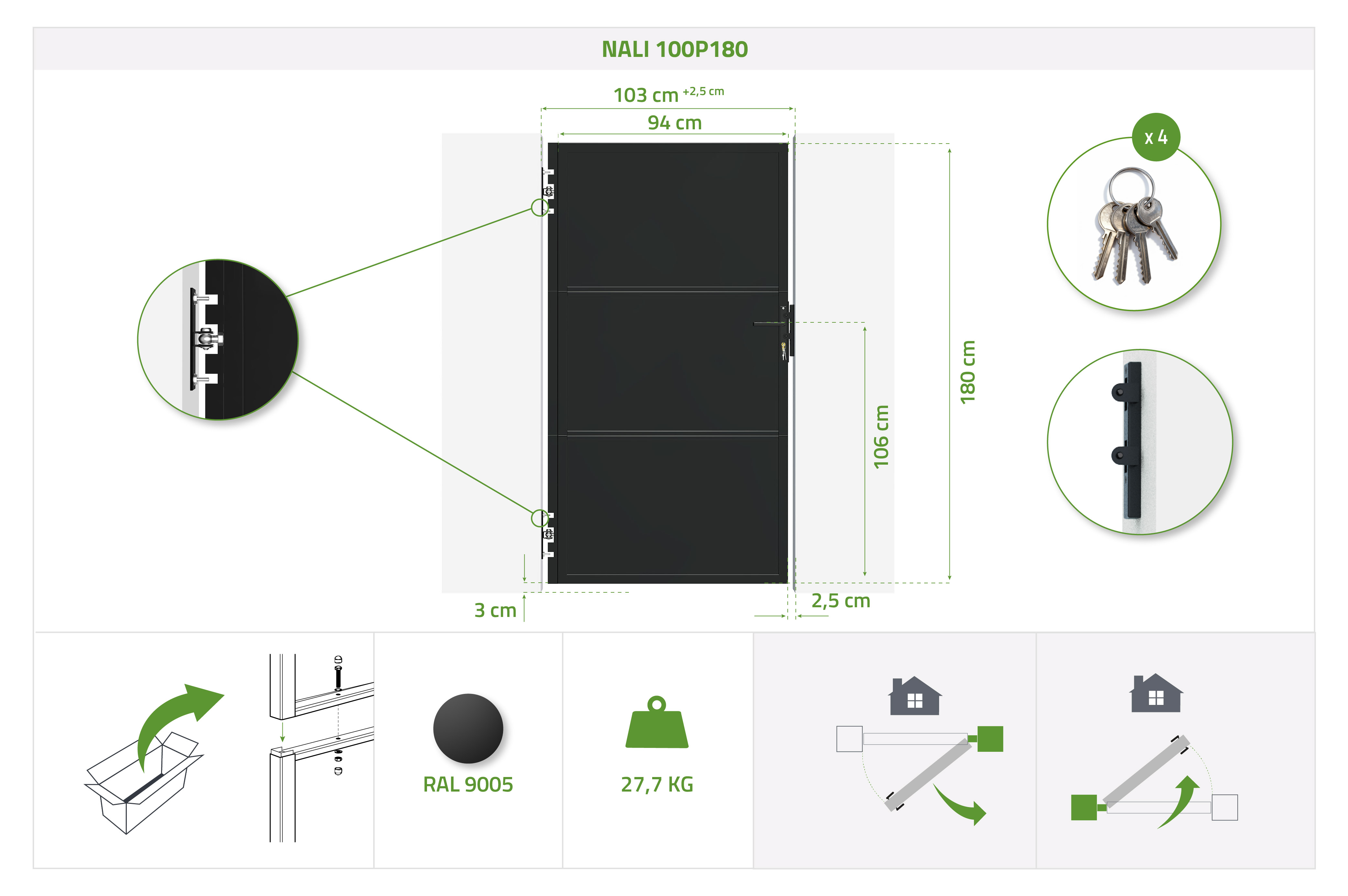 The NALI steel gate is a symbol of refinement and solidity, with solid steel panels that ensure optimal protection. Its minimalist style, with clean lines, is ideal for those looking for a contemporary yet secure solution. The NALI garden gate offers great strength while adding a modern touch to your outdoor space.